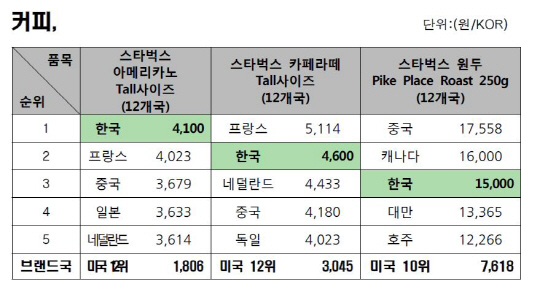 한국은 스타벅스 아메리카노 뿐만 아니라 카페라떼와 스타벅스 원두에서도 각각 2, 3위로 13개국 가운데 비싼 편에 속했다.