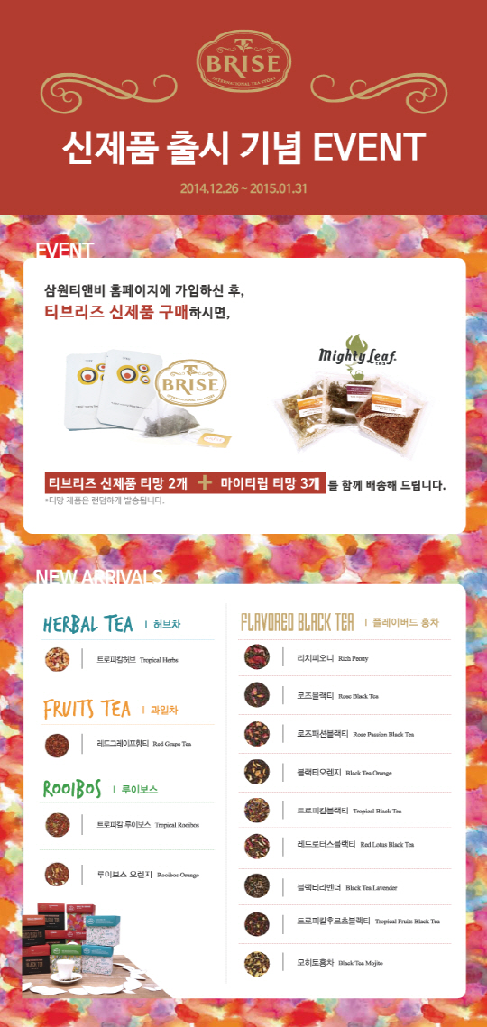 31일까지 진행되는 이번 신제품 출시 기념 이벤트는 삼원티앤비 홈페이지(www.samwontnb.com)에 회원 가입을 한 후 삼원티앤비 쇼핑몰(SHOP) 메뉴에서 티브리즈 신제품 13종 중 1종이라도 구매하면 누구나 자동 응모된다. 100% 당첨되는 이번 이벤트의 경품은 티브리즈 신제품 티백 2종 및 마이티립 티백 3종으로 재고 소진 시까지 구매한 티브리즈 신제품과 함께 랜덤으로 배송된다.