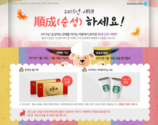 순성산업 관계자는 "을미년 새해를 맞이해 순성 카시트를 사랑해주시는 많은 고객들이 모두 순성(順成)하는 한 해를 보내시길 바라는 마음을 담아 이번 기획전을 준비했다"며 "순성 카시트와 함께 안전한 한 해를 보내고자 하는 고객들을 위해 풍성한 혜택을 준비한 만큼 소비자들의 큰 호응이 기대된다"고 전했다.