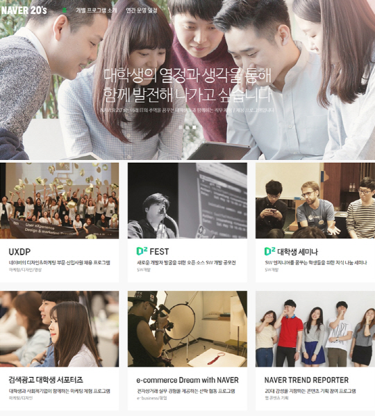 12일 네이버에 따르면 개발자들을 위한 D2(For Developers, By Developers) FEST 경진대회, D2 대학생 세미나, 디자이너/마케터들을 위한 UXDP(User eXperience Design&marketing Practicum) 워크샵, 예비 서비스 기획자들을 위한 ,네이버 트렌드 리포터, 이커머스 전공자들을 위한 e-commerce Dream with NAVER 프로젝트 등의 대학생 지원 프로그램을 제공한있다. 대학생들은 NAVER 20's 사이트를 통해 필요로 하는 프로그램의 정보를 손쉽게 확인할 수 있고, 모집 시기를 놓치지 않게 메일이나 SMS로 일정 알림을 받아볼 수 있다.