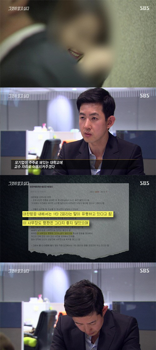 이날 제작진은 한 남성으로부터 전해 받은 USB 안의 녹취파일을 공개했는데, 파일에는 중년 남자들이 박창진 사무장에게 국토교통부 조사에서 입을 맞추라며 은밀한 지시를 내리는 것과 '어떤 이유를 대더라도 부사장의 지시가 아니라고 진술하라', '이번 일이 끝나고 나면 절대 잊지 않겠다' 등의 말이 담겼다.
