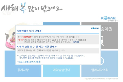 15일에는 오전 10시부터는 13일, 14일 이틀간 진행된 설날 기차 예매 후 잔여(입석)의 승차권 예약이 진행된다.
