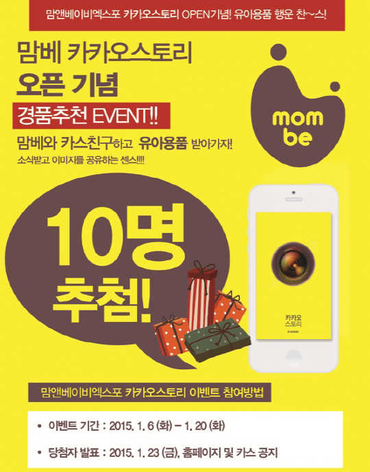 카카오스토리 채널 오픈을 기념해 경품 이벤트도 실시한다. 20일까지 맘앤베이비엑스포 카카오스토리와 친구를 맺은 사람 중 추첨을 통해 70만원 상당의 2015년형 리안 스핀LX 유모차 등 풍성한 경품을 제공한다. 당첨자는 23일 맘앤베이비엑스포 공식 홈페이지 및 카카오스토리 채널을 통해 발표한다.