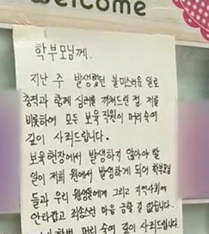 인천 K어린이집은 'WELCOME'이 쓰여진 정문 앞에 대자보를 걸고 '학부모님께'라는 제목으로 "지난 주 발생했던 불미스러운 일로 충격과 함께 심려를 끼쳐드린 점. 저를 비롯하여 모든 보육 직원이 머리 숙여 사과드립니다"라고 사과했다.