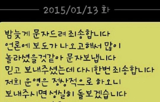 이 어린이집 원장이 학부모에게 보낸 문자 내용도 논란이 되고 있다. 한 학부모가 SNS에 올린 것으로 알려진 원장의 문자에는 "보도를 통해 놀라셨을 것 같다"며 "믿고 보내주셨는데 다시 한 번 죄송하다"라고 고개를 숙였다.