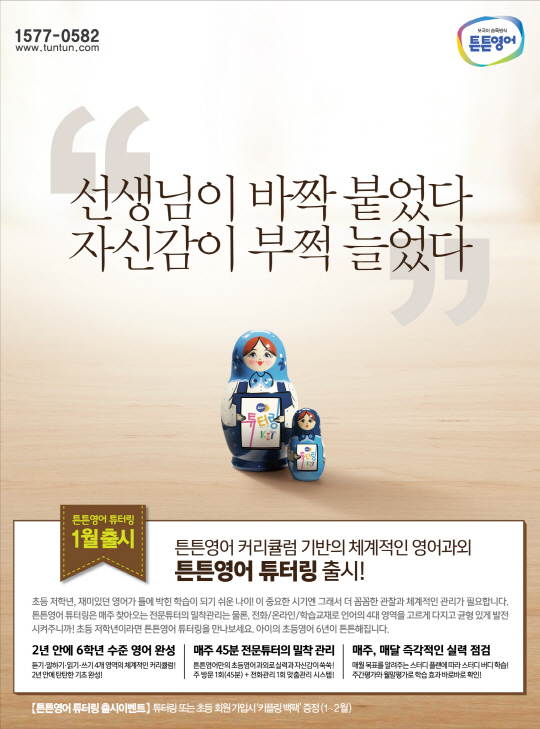 한편, 튜터링은 회원에 대한 집중 학습 관리를 통해 기본 영어 실력을 갖출 수 있도록 도와주는 초등 영어 프로그램이다. 2년 안에 초등학교 6학년 수준의 영어 완성을 목표로 하여 영어에 대한 듣기, 말하기, 읽기, 쓰기 실력을 고르게 향상시키고 영어로 자유로운 의사표현을 할 수 있는 능력을 키워준다. 튜터링 프로그램에 대한 자세한 사항은 튼튼영어 홈페이지(www.tuntun.com)에서 확인할 수 있다. 문의 : 튼튼영어 1577-0582 / www.tuntun.com.