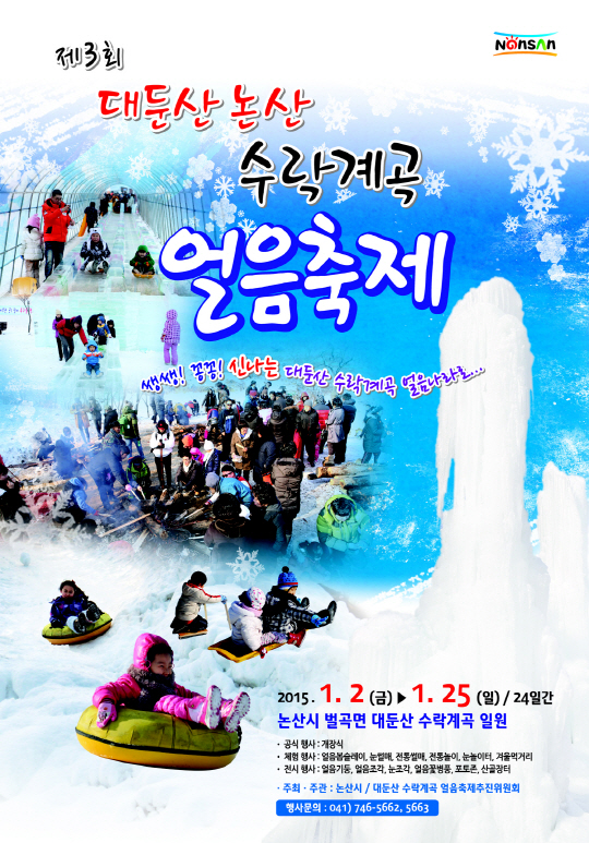 신나는 겨울 놀이를 즐기며 비경까지 덤으로 감상할 수 있는 '제3회 대둔산논산수락계곡 얼음축제'가 인기리에 펼쳐지고 있다. 지난 7일부터 25일까지 '쌩쌩! 꽁꽁! 신나는 대둔산 수락계곡 얼음나라로…' 를 부제로 대둔산 수락계곡 일원에서 펼쳐지고 있는 잔치마당에는 얼음봅슬레이, 눈썰매, 얼음볼링 등 신나는 체험행사와 얼음하늘기둥, 얼음조각, 눈 조각, 얼음꽃병풍 등 다양한 전시행사가 함께 펼쳐지고 있다.