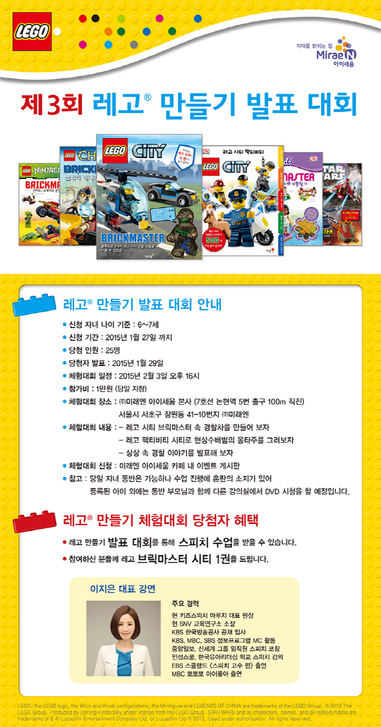 교육출판전문기업 ㈜미래엔(대표 김영진)의 아동 출판 브랜드 '미래엔 아이세움'이 내달 3일 미래엔 본사에서 '제3회 레고 만들기 발표 대회'를 개최한다.