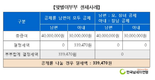 납세자연맹 홍만영 팀장은 "소득공제와 세액공제 효과를 감안하지 않고 무조건 과세표준을 낮추는 쪽으로 맞벌이부부 절세를 권유하는 것은 잘못"이라며 "부부 각각의 결정세액이 동일하도록 과세표준과 세액공제를 균등하게 배분하는 게 올해 맞벌이부부 연말정산의 핵심"이라고 설명했다.
