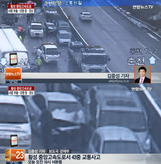 16일 오전 10시 14분께 강원 횡성군 공근면 공근리 중앙고속도로 부산방면 345㎞ 지점에서 승용차 35대와 화물차 7대, 버스 1대 등 차량 43대가 연쇄 추돌했다.