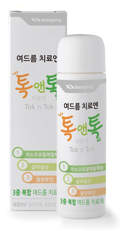 광동제약의 '톡앤톡 외용액'은 살리실산과 이소프로필메칠페놀, 알란토인 등 세 가지 성분이 각질용해, 여드름균 살균, 염증 완화의 3중 작용을 통해 효과적으로 여드름을 치료한다.