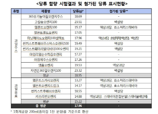 당류 함량(200㎖ 기준)을 분석한 결과에서는 전반적으로 주스가 오렌지 과즙 비율이 적은 음료에 비해 당류 함량이 높았다. 특히 웅진식품의 오렌지 주스 제품인 고칼슘오렌지100(23.51g)과 자연은365일오렌지100(23.32g)가 당류 함량 1, 2위를 차지했는데 전체 평균치 17.96g을 크게 웃돌았다. 이들 두 제품 모두 백설탕을 첨가했다.
