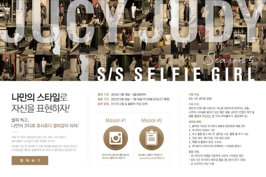 2015년을 맞아 새롭게 진행되는 다섯 번째 '2015 셀피걸 프로젝트'는 자신이 직접 찍은 사진, 혹은 자신의 스타일링을 자랑하고 싶은 여성이라면 누구나 참여 가능하다. 인스타그램에 자신을 가장 잘 보여줄 수 있는 사진을 촬영해 #쥬시쥬디셀피걸5 해시태그를 달아 포스팅하고, 구글페이지(goo.gl/forms/OgYDtM9112)를 통해 간단한 신청서를 작성하면 참가 신청이 완료된다.