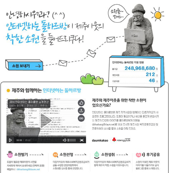 도움이 필요한 개인이나 단체는 이메일(dkharbang@daum.net)을 통해 신청하면 다음과 제주공동모금회가 공동 구성한 선정위원회에서 심사를 통해 후원 대상자를 선정하게 되며 심사결과는 2월 3주차에 발표할 예정이다. 신청서 양식 등 자세한 내용은 인터넷하는돌하르방 홈페이지 (http://hope.daum.net/daumharbang)에서 확인이 가능하다. 2008년에 시작한 '인터넷하는돌하르방'은 도움이 필요한 제주 이웃의 사연을 인터넷에 올리면 착한 소원을 들어주는 지역공헌사업이다. 다음카카오는 현재까지 개인 212건, 단체 46건 등 총 258건의 소원을 후원해오고 있다.