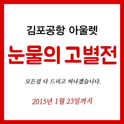 이에 김포공항 아울렛 관계자는 "비록 영업 종료 전 마지막 눈물의 고별전이긴 하지만 끝까지 고객들에게 좋은 상품을 제공해 최고의 만족을 서비스 하겠다"며 "오는 23일까지 지속적인 상품 공급으로 최선을 다하는 고별전을 진행할 계획이니 더 많은 고객님들과 함께 하고 싶다"라고 전했다.