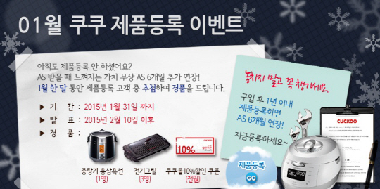 건강생활가전기업 쿠쿠전자(대표 구본학, www.cuckoo.co.kr)는 쿠쿠 제품을 등록하면 무상 AS 6개월 연장 및 다양한 혜택을 제공하는 '1월 제품 등록 이벤트'를 시행한다.