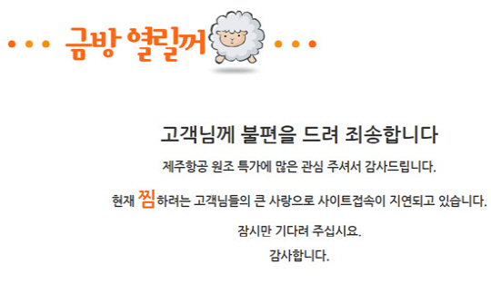 현재(오후 3시 30분) 제주항공 사이트에는 "고객님께 불편을 드려 죄송하다"는 안내 문구가 나온다.