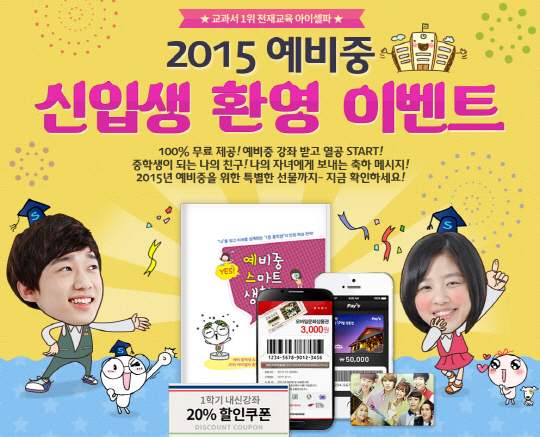 '신입생 환영 이벤트'는 올해 중학생이 되는 친구나 자녀에게 축하 메시지를 보낸 회원들에게 경품을 증정한다. 이벤트 참가자 전원에게 '아이셀파 2015년 1학기 내신강좌 할인권'을 제공하며 추첨을 통해 '예비중 가이드북과 스타링 교통카드(30명)', '아웃백 디지털 상품권 5만원권(10명)' 등을 증정한다.