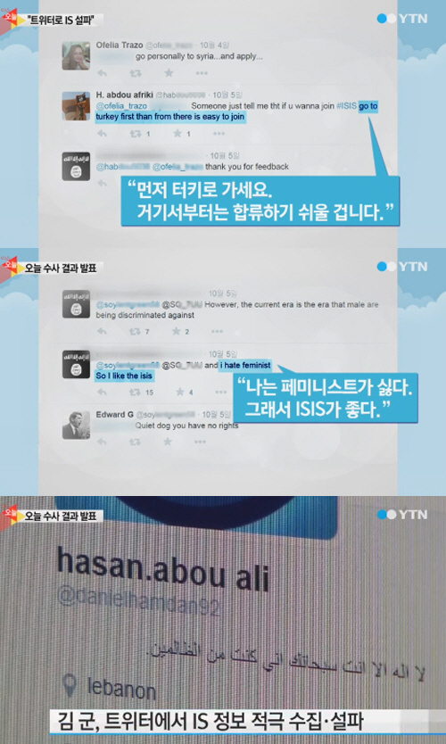 'sunni mujahideen'라는 이름을 사용한 김 군의 계정은 2013년 1월 처음 개설됐으며, 프로필 사진과 배경은 IS를 상징하는 깃발로 설정됐다.
