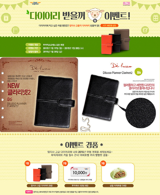 28일까지 진행되는 이번 이벤트에 대한 자세한 내용은 투어익스프레스 홈페이지 (www.tourexpress.com)와 페이스북(www.facebook.com/tourexpress2)에서 확인할 수 있다. 다이어리에 적고 싶은 여행 명언을 선정하면 이벤트 참여가 완료된다. 투어익스프레스는 이벤트에 참여한 사람들 중 추첨을 통해 10만원 상당의 양지사 천연소가죽 디루소 뉴클라리넷 플래너 다이어리, 투익캐쉬 등 푸짐한 상품을 제공한다. 이벤트 경품으로 제공되는 양지사 디루소 뉴클라리넷2 B6 플래너는 천연소가죽으로 제작됐고 카드 및 포켓 수납공간을 갖추고 있어 실용성과 고급스러움을 겸비한 프리미엄 다이어리 브랜드다. 양지사는 1976년 설립된 오랜 전통을 지닌 회사로 2014 대한민국 대표 우수기업 인증'의 다이어리 부문에서 우수기업으로 선정된 고품격 다이어리 전문 업체다.