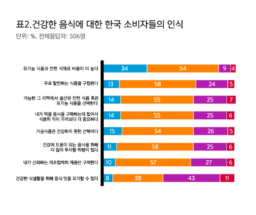 건강한 음식에 대한 한국 소비자의 인식을 살펴보면 88%가 '유기농 식품과 천연 식재료 비용이 더 높다는 것에 수긍한다'고 생각하고 있었고 64%가 '내가 먹을 음식을 구매하는데 있어서 식품의 질이 가격보다 더 중요하다'고 생각하고 있었다.