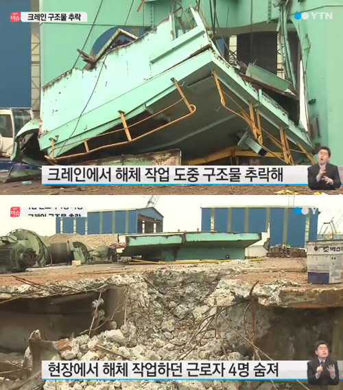 부산의 한 선박 구조물 공장에서 대형 크레인 구조물이 떨어져 근로자 4명이 숨지는 사고가 발생했다.