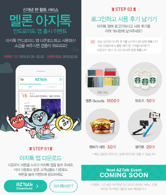 멜론은 '아지톡' 출시를 기념해 다운로드 이벤트를 2월 3일까지 진행한다. 참여방법은 이벤트 기간 동안 '아지톡' 앱을 다운로드하고 로그인 후, 게시판에 사용 후기를 남기면 이벤트에 응모된다.당첨자 총 1천120명에게 다양한 경품이 제공된다.