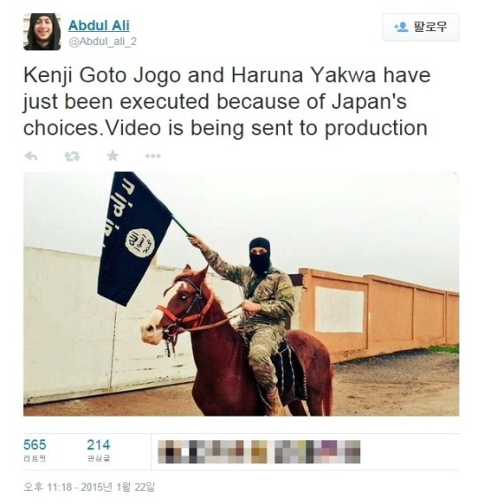 압둘 알리라는 트위터 이용자는 22일(현지 시각) 트위터에 "일본의 선택으로 고토 겐지와 유카와 하루나가 방금 처형됐다"며 "(처형 장면을 촬영한 ) 비디오가 제작되는 중"이라는 내용의 트위터를 올렸다.