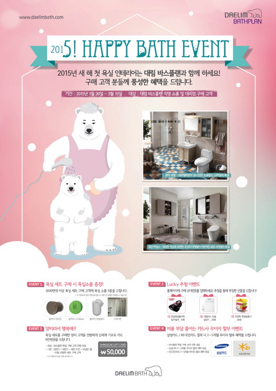 욕실 토탈 브랜드 '대림바스'(사장 강태식)가 2월 15일까지 직영 쇼룸 및 전국 대리점에서 욕실 리모델링 세트를 구입한 고객을 대상으로 하는 '오! 해피 바스(Oh! Happy Bath)' 이벤트를 실시한다.