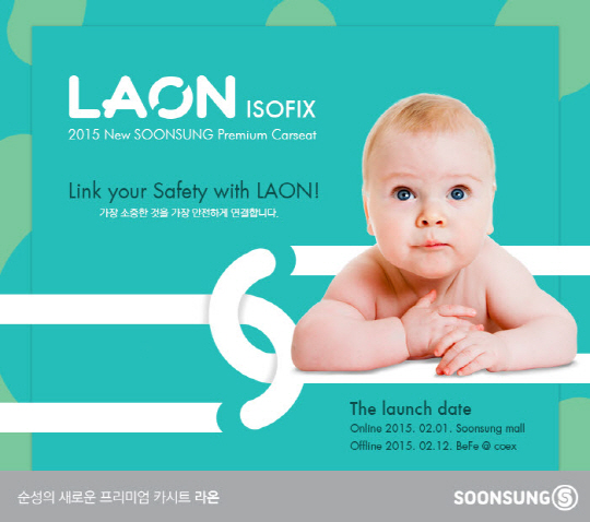 26일 홈페이지를 통해 공개된 순성의 신제품 티저 이미지에 가장 눈에 띄는 문구는 'LAON'이다. '라온'은 순 우리말로 '즐거운'을 뜻한다. 연결고리 안에 위치한 아이의 모습과 'Link your Safety with LAON, 가장 소중한 것을 가장 안전하게 연결합니다'라는 슬로건은 아이가 성장기간 동안 더 안전하고 즐거울 수 있도록 '라온(LAON)'이 함께 하겠다는 특별한 의미를 전한다. 부모와 아이의 교감을 고려한 신제품의 특징을 Link(연결고리)라는 키워드로 슬로건에 담았다.