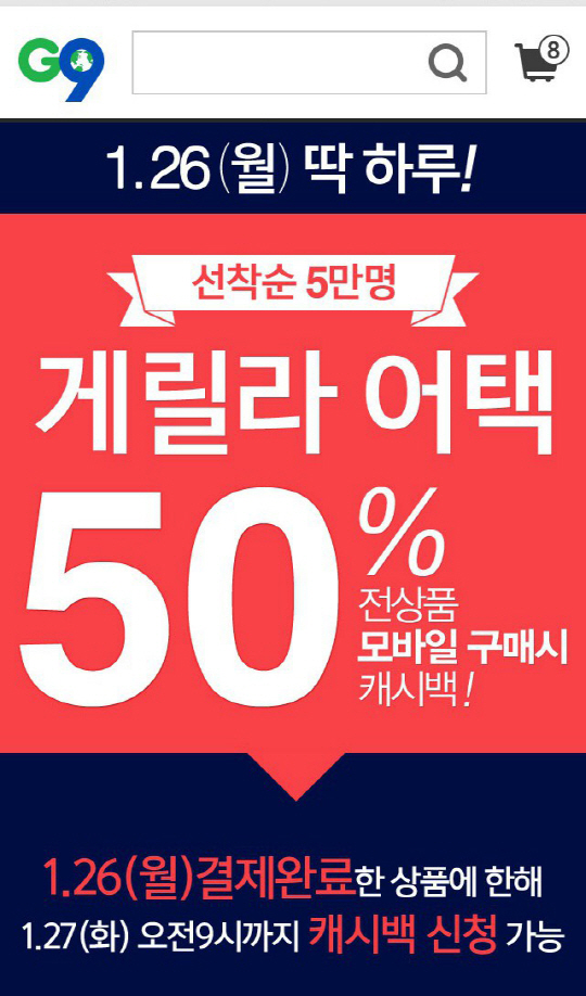26일 하루 동안 G9 모바일 앱에서 상품(티켓/상품권 제외) 구매 시 결제 금액의 50%(최대 1만원)를 G캐시로 돌려준다. 선착순 5만명에게 제공되는 이번 캐시백은 프로모션 페이지에서 26일 자정부터 신청 가능하다. G캐시는 해당 기간 동안 한 ID당 1건 신청 할 수 있으며, 2월 13일 일괄 지급된다.
