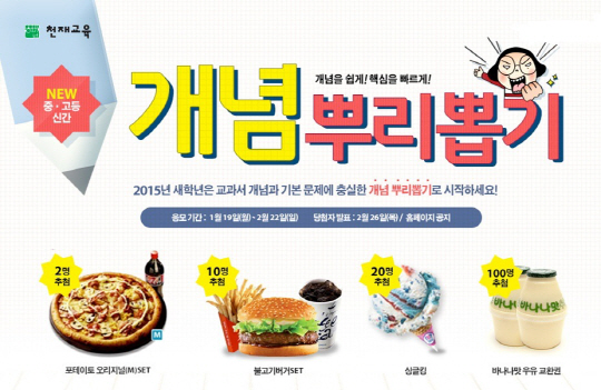 신간 출시를 기념해 2월 22일까지 이벤트도 진행한다. 천재교육 홈페이지(www.chunjae.co.kr)를 통해 참여할 수 있으며, 낱말 카드를 뒤집어 같은 글자 2개를 찾아 교재 이름 '개념 뿌리뽑기'의 여섯 글자를 완성하면 된다. 추첨을 통해 '도미노 피자세트(2명)', '롯데리아 불고기버거세트(10명)', '베스킨라빈스 싱글킹(20명)', '바나나맛 우유(100명)' 등을 경품으로 제공한다.