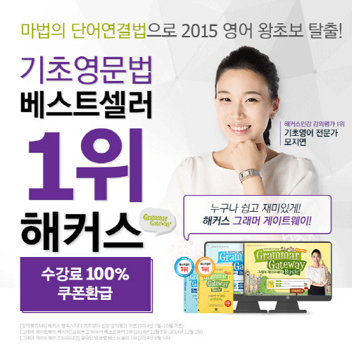 해커스인강은 이와 더불어 '기초영어 완전정복 패키지' 이벤트를 진행 중이다. '그래머 게이트웨이 인강'과 교보문고 외국어 베스트셀러 1위(2014년 11월 5일~12월 2일) '그래머 게이트웨이 시리즈' 교재를 동시에 만나볼 수 있는 기초영어 인강 패키지로, 신청자에게는 토익/토플/텝스/아이엘츠 모든 인강을 수강할 수 있는 '수강료 100% 환급 쿠폰'을 제공한다. 또 그래머 게이트웨이 인터미디엇 강의 구매자 전원에게 '모바일 수강권'을 증정해 추가비용 없이 모바일에서도 수강할 수 있도록 한다. 아울러 교재 배송비를 무료로 지원하고, 해커스 스타강사의 '1:1 멘토링 서비스'를 제공해 주목받고 있다. 송진현 기자 jhsong@sportschosun.com