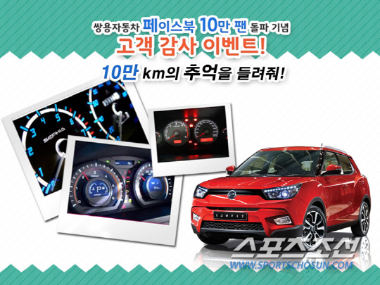 이에 쌍용차는 10만팬 달성을 기념하여 다양한 이벤트를 진행한다. ▲쌍용차와 함께하고 싶은 10명의 친구를 초대하는 '친구소환 1+10 이벤트' ▲매일 10명에게 커피 기프티콘을 증정하는 '행운의 룰렛' ▲10만km에 가장 근접한 주행거리가 표시된 인증샷을 공유하는 팬에게 추첨을 통해 주유상품권과 오일교환권 증정 행사 등 오는 30일까지 다채로운 고객 참여 이벤트가 실시된다.