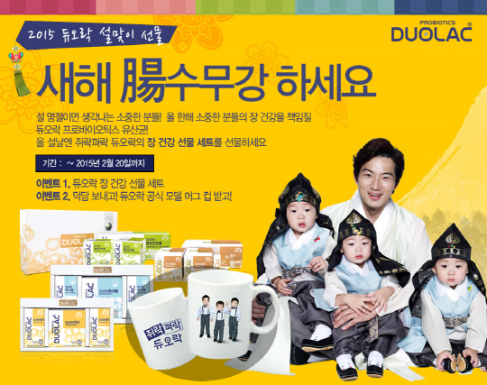 프로바이오틱스 유산균 전문기업 ㈜쎌바이오텍(대표 정명준)이 2월 20일까지 듀오락 2015 설맞이 선물세트 이벤트 '새해 腸수무강 하세요!'를 쇼핑몰 '듀오락 온라인몰(www.duolac.co.kr)'에서 진행한다.