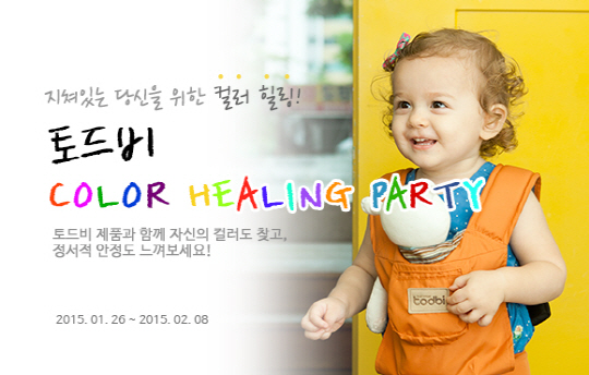 순수 국내 출산유아용품 전문 브랜드 토드비(www.todbi.com)가 육아에 지친 엄마들의 마음을 위로해주는 '컬러 힐링 이벤트'를 오는 2월 8일까지 진행한다.
