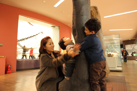 목포자연사박물관에서 공룡다리 만져보기 체험에 나선 가족.