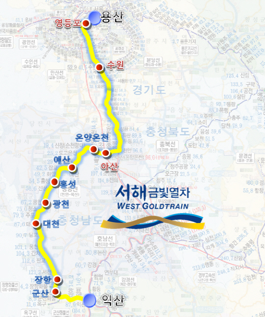 서해금빛열차는 서울 용산역을 출발해 장항선을 따라 아산-예산-홍성-보령-서천-군산-익산 등 서해 7개 지역의 보석과도 같은 관광지를 찾아 떠나는 관광전용열차다. 특히 세계 최초로 열차에 도입된 한옥식 온돌마루실과 습식-건식 족욕카페 등을 갖춰 열차여행의 새로운 재미를 줄 것으로 기대를 모으고 있다. 온돌마루실은 이미 한 달치 예약이 마감됐을 정도로 인기다.