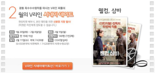 광동제약 'V라인 시네마데이트'가 이번에 선보일 '웰컴, 삼바'는 직업, 성별, 인종, 국적이 모두 다른 두 사람이 진정한 우정을 찾아가는 과정을 그린 영화다. 유럽에서 2,100만 관객의 흥행 신화를 쓴 영화 '언터처블: 1%의 우정'의 올리비에르 나카체 감독과 주연배우 오마 사이가 함께 한 신작으로, 칸 영화제 여우주연상 수상에 빛나는 샤를로뜨 갱스부르가 합세, '인간의 우정'에 대한 아름다운 이야기를 선사한다.