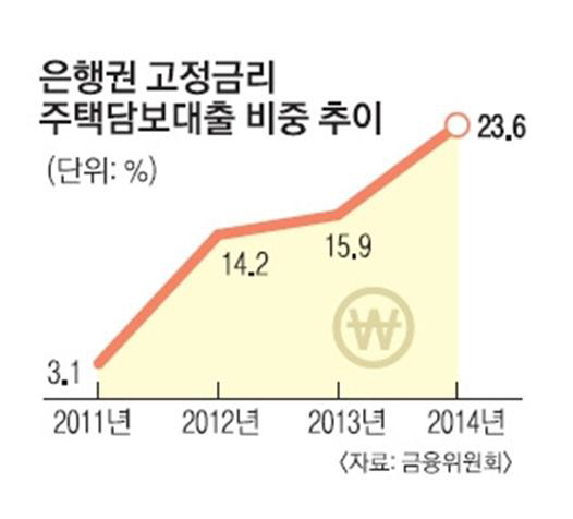 지난해 은행권 주택담보대출 중 고정금리대출의 비중이 전년말 15.9%에서 23.6%로 7.7%포인트 상승한 것으로 나타났다. 비거치식 분할상환대출 비중도 18.7%에서 26.5%로 7.8%포인트 상승했다.