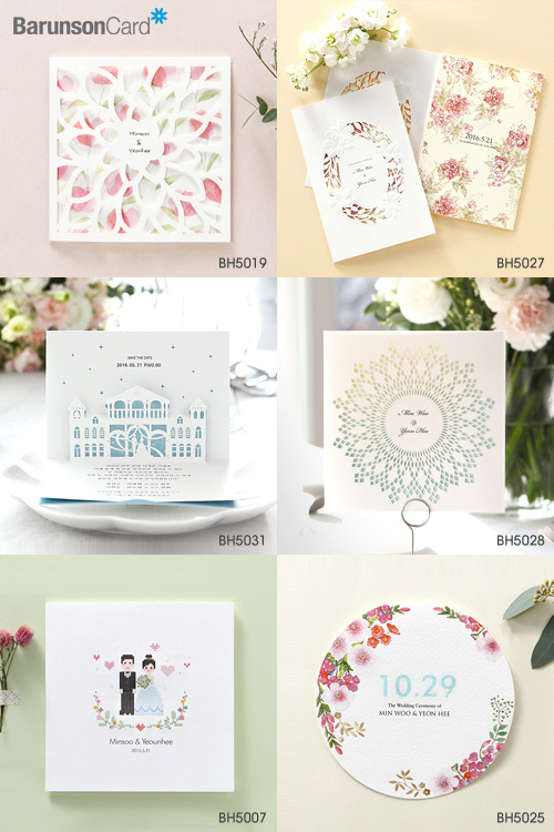 BH5007, BH5008은 청첩장에 흔히 쓰이지 않던 십자수 무늬를 적용한 이색 디자인으로 눈길을 끈다. 신랑 신부, 하트 등 결혼을 연상시키는 디자인 아이콘을 십자수 무늬로 표현해 귀엽고 사랑스러운 느낌을 불어넣었다. 반짝이는 은박 가공과 볼록한 엠보싱 효과로 실제 십자수 같은 느낌을 최대한 구현했다. BH5032는 청첩장을 받는 하객을 배려한 아이디어 제품이다. 심플한 청첩장 앞면 중앙에 종이 플라워 리스(Wreath, 원형 화환)가 끼워져 있는데, 이 플라워 리스는 탈부착이 가능해 떼어내면 책갈피나 장식으로 사용할 수 있다.
