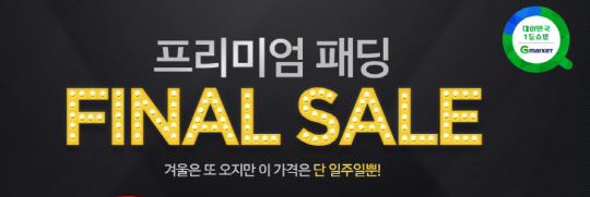 국내 최대 온라인쇼핑사이트 G마켓(www.gmarket.co.kr)과 옥션(www.auction.co.kr)이 공동으로 오는 2월 1일까지 '프리미엄 패딩 FINAL SALE' 프로모션을 진행하고 캐나다구스, 무스너클 등 해외 인기 브랜드 상품을 최대 58% 할인가에 판매한다. 각 사이트에서 '프리미엄 패딩 파이널'을 검색하면 대표상품을 만나 볼 수 있다.