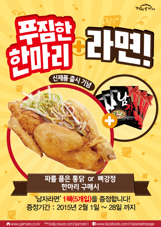 이번 신메뉴 출시 이벤트는 전국 가마로강정 가맹점에서 신 메뉴 한 마리를 구입 하는 모든 고객에게 라면 1팩(5개입)을 증정하는 행사이다. 2월 한달 간 진행되는 이벤트에 최소 30만개 이상의 라면이 증정될 것으로 예상하고 있다.