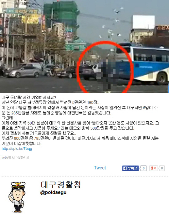 정신질환을 앓는 것으로 알려진 안모(28·무직)씨가 대구 도심 횡단보도에 뿌린 5만원권 지폐 160여장(800여만원)을 되찾아주려는 시민들의 발길이 이어지고 있는 가운데, 50대로 추정되는 한 독지가가 최근 500만원을 기부했다.