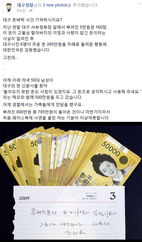대구 돈벼락 사건의 안타까운 사연이 알려지자 최근 한 독지가가 500만원을 선뜻 기부해 화제다
