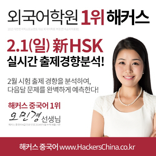 최신 출제경향을 반영한 고품질강의로 유명한 해커스 중국어(www.HackersChina.co.kr)가 2월 1일 HSK 시험일을 맞아 '실시간 출제경향분석 서비스'를 제공한다. 해커스 중국어 사이트 내 자유게시판에서 제공하는 이번 HSK 4급 출제경향분석은 해커스 중국어 인강 매출 1위 오민경 강사가 진행한다.