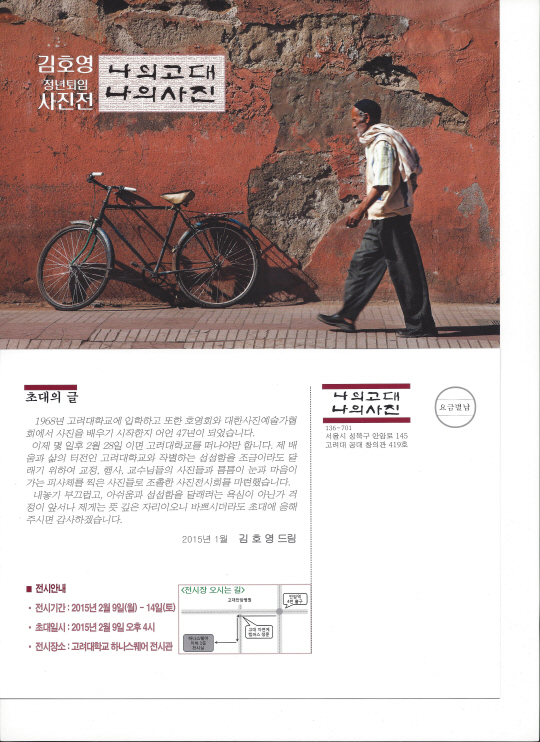 고려대학교 공과대학 기계공학부 김호영 교수가 오는 9일 정년퇴임을 맞아 모교와 평생 일터였던 고려대학교를 추억하고 그의 사진활동을 정리하며 기념 사진전을 연다. 사진은 고려대학교 애기능 사진 4점, 1969년과 1970년 고.연전 사진 및 축제 사진 35점, 전 현직 교수 사진 44점과 작품사진 35점 등 총 100여점이 전시된다. 작품들은 고려대학교 자연계 캠퍼스 하나스퀘어 전시실에서 2월 9일(월)부터 14일(토)까지 전시된다. 김 교수는 2월 28일 정년퇴임한다. 박재호 기자 jhpark@sportschosun.com