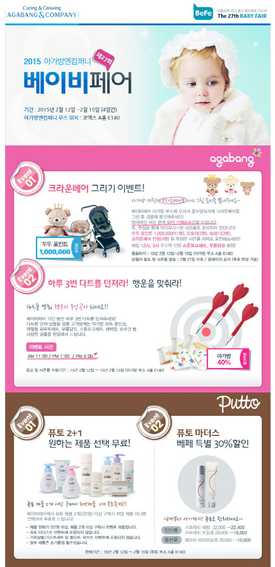 유아동복·용품 전문기업 아가방앤컴퍼니(대표이사 이원재)가 12일부터 15일까지 서울 삼성동 코엑스에서 개최되는 '제 27회 베페 베이비페어'에서 온·오프라인 이벤트를 실시한다