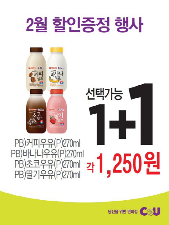 'CU(씨유)'는 2월 1일부터 말일까지 PB커피 우유를 포함한 PB가공유 4종에 대해 1+1 행사를 진행하고 서울 딸기우유 등 가공유 25종, 남양 맛있는 우유 등 흰우유 3종, 동원 드링킹요구르트 딸기 등 발효유 18종, 총 50여 유제품에 대한 2+1 행사를 펼친다.