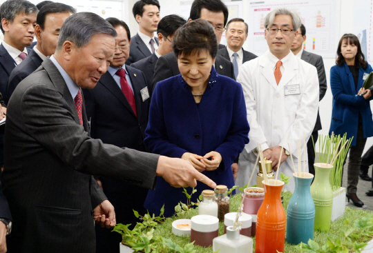 4일 열린 충북 창조경제혁신센터 출범식에 참석한 박근혜 대통령이 구본무 LG 회장(앞줄 맨 왼쪽)을 비롯한 관계자들과 함께 충북산 약용작물이 첨가된 화장품을 둘러보고 있다.